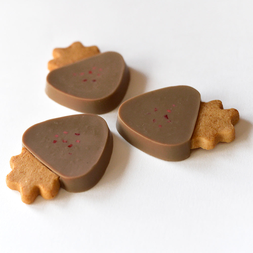 じっくり焼いたクッキーに、フリーズドライの苺を混ぜ込んだミルクチョコレートを重ね合わせた苺の形をしたお菓子です。