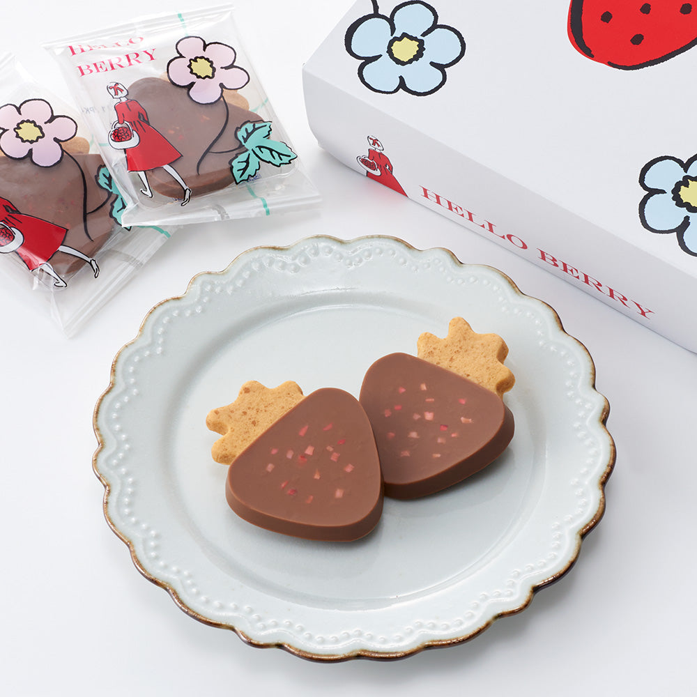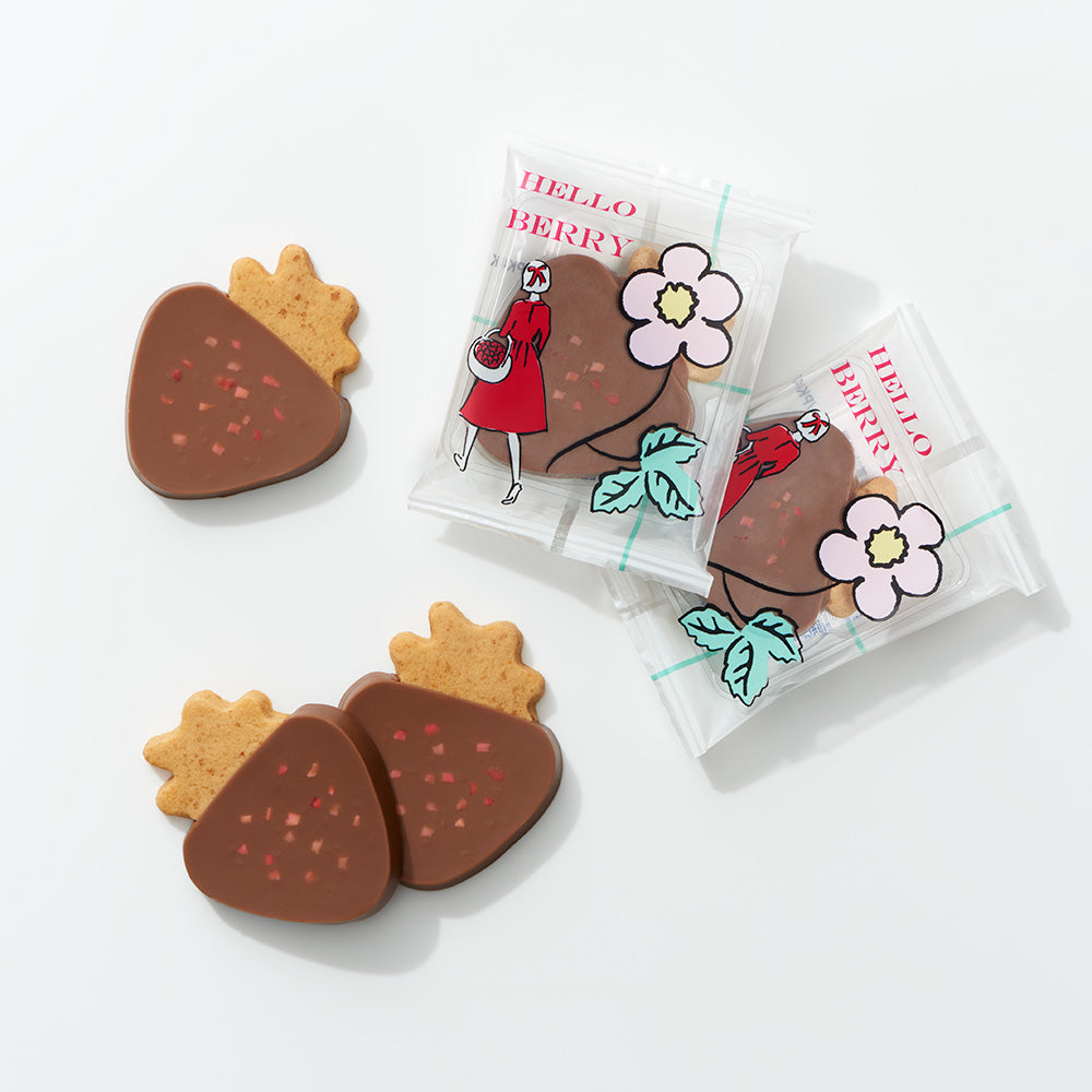 フリーズドライ苺のつぶつぶが入ったミルクチョコレートにクッキーを重ねた、苺形のお菓子「ハローベリー」10個入りです。